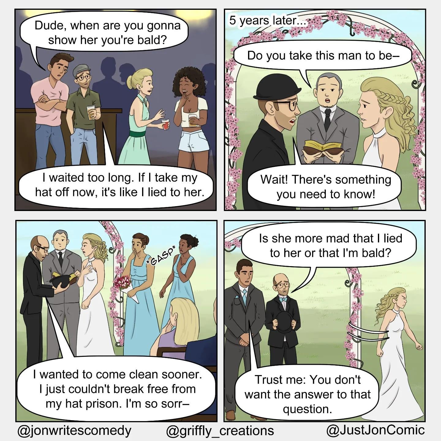 He wore that hat in the shower and during sex? That’s commitment to insecurity.