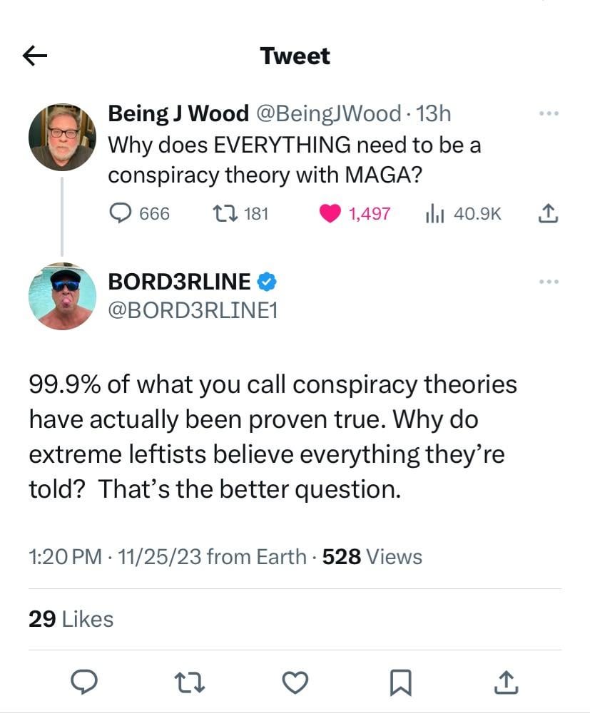 This has become the new parroted line online by conservatives i keep seeing. Just saying vaguely that that most or all conspiracies have been proven right without a question. They never give examples and if they do its just sketchy shit that is well known history at this point anyway like mk ultra.