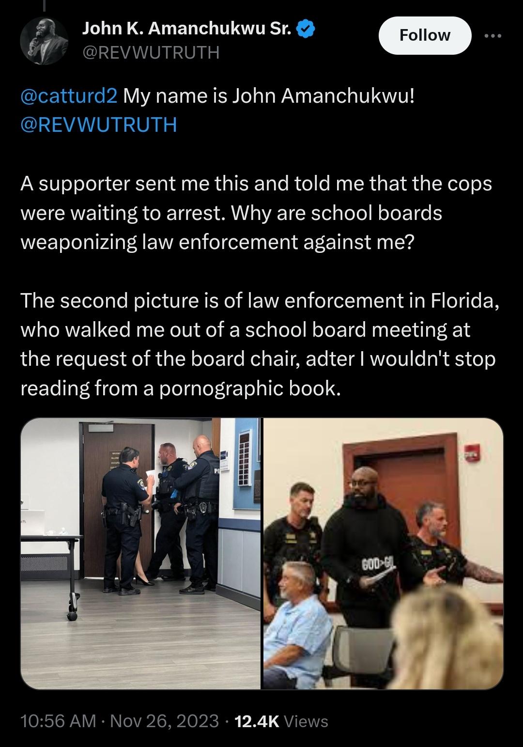 Ahem, good sir. I believe the reason that law enforcement are removing you from a public meeting is because (checks tweet): wouldn’t stop reading pornography at said meeting, even after the board chair asked you to stop. I hope that clears things up.