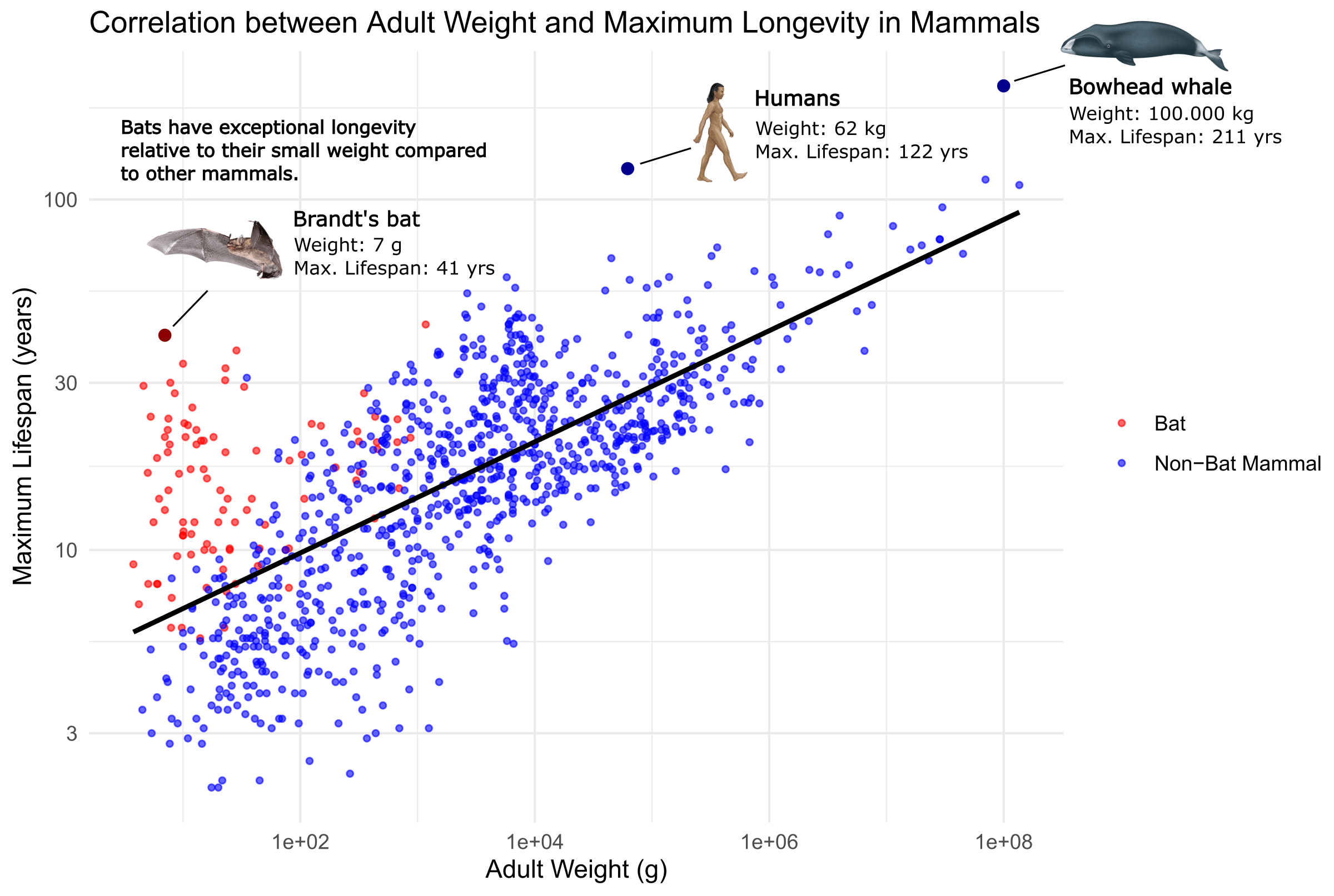 Correlation between maximum lifespan and body weight across mammals. Species with exceptional longevity are highlighted. [OC] by ThunderKant_1