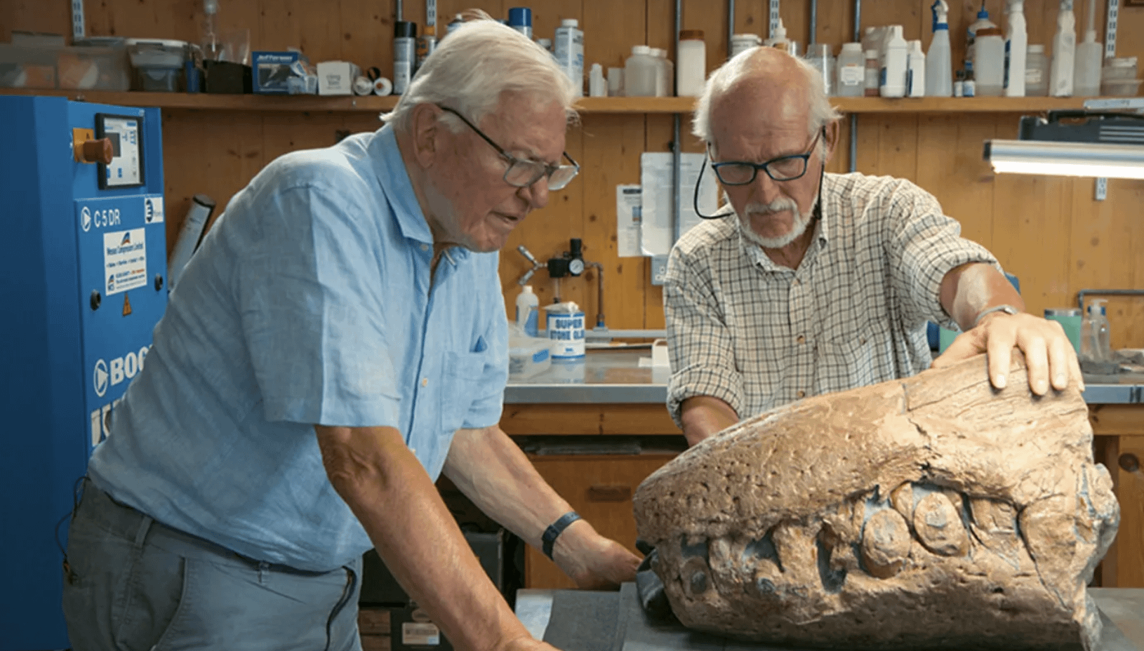Sir David Attenborough being shown the snout of a massive Jurassic era-pliosaur. This specimen was recently discovered along England’s Dorset Coast by JurassicPark9265