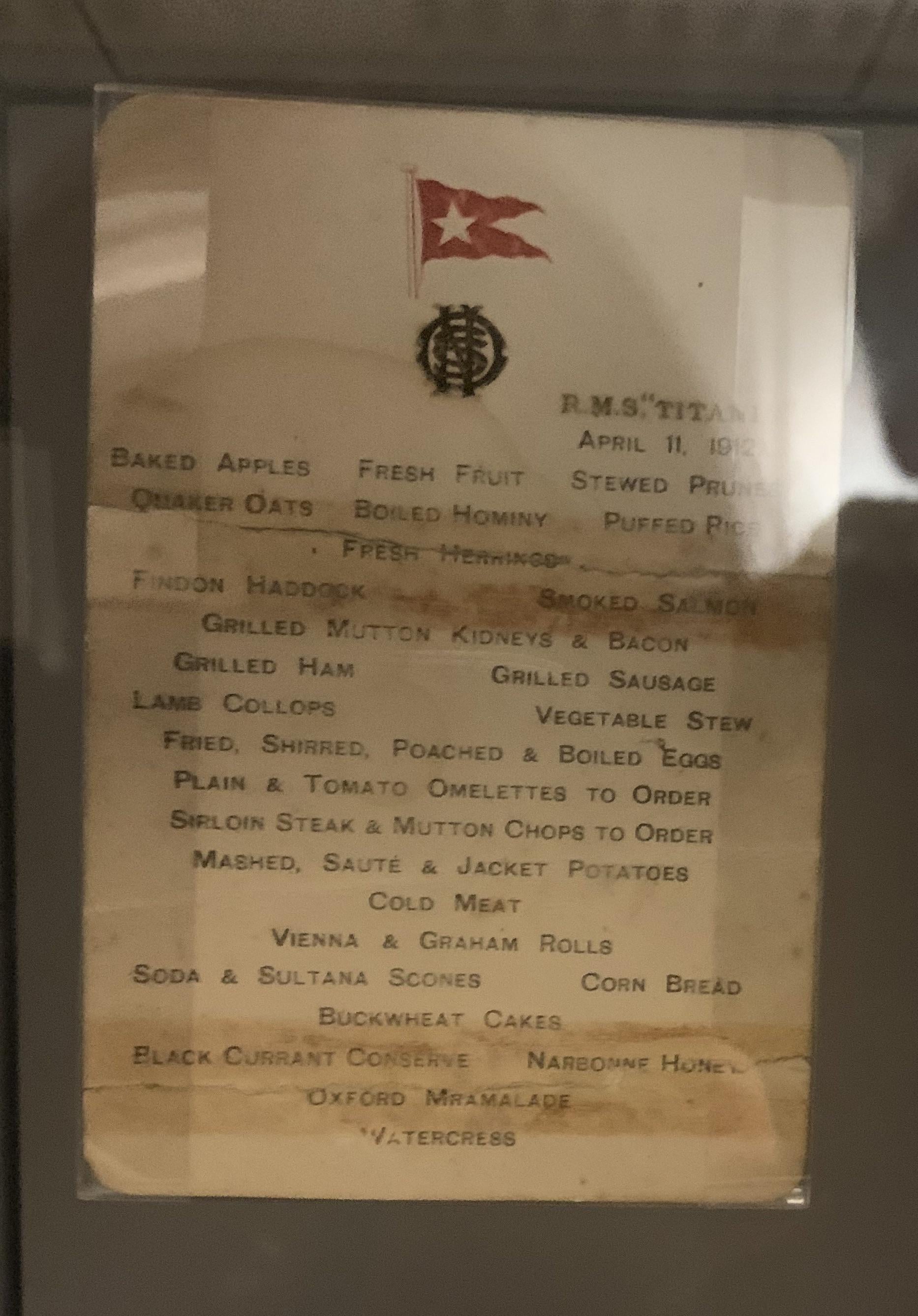 A menu from the RMS Titanic. Each class had a different menu, this was the breakfast menu for 1st class passengers.