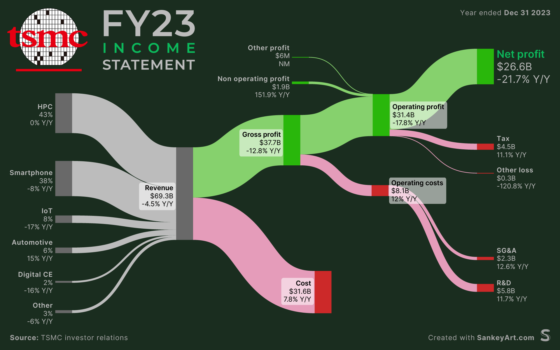 [OC] TSMC released its FY23 income statement today and forecasted over 20% revenue spike for 2024, fuelled by AI expansion. by sankeyart