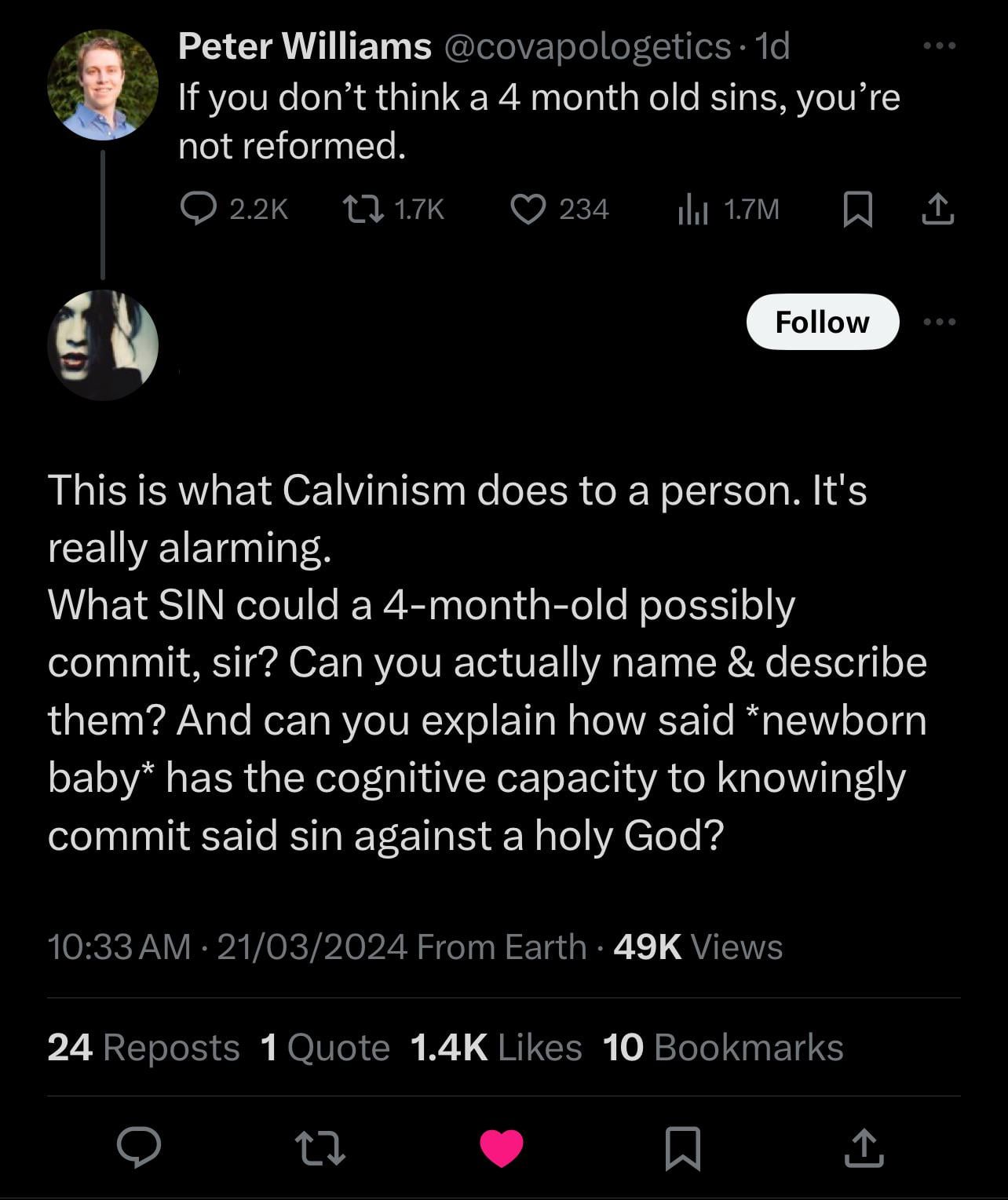 Well apparently being born and being alive is a sin against “God”. So for these people even babies can sin.