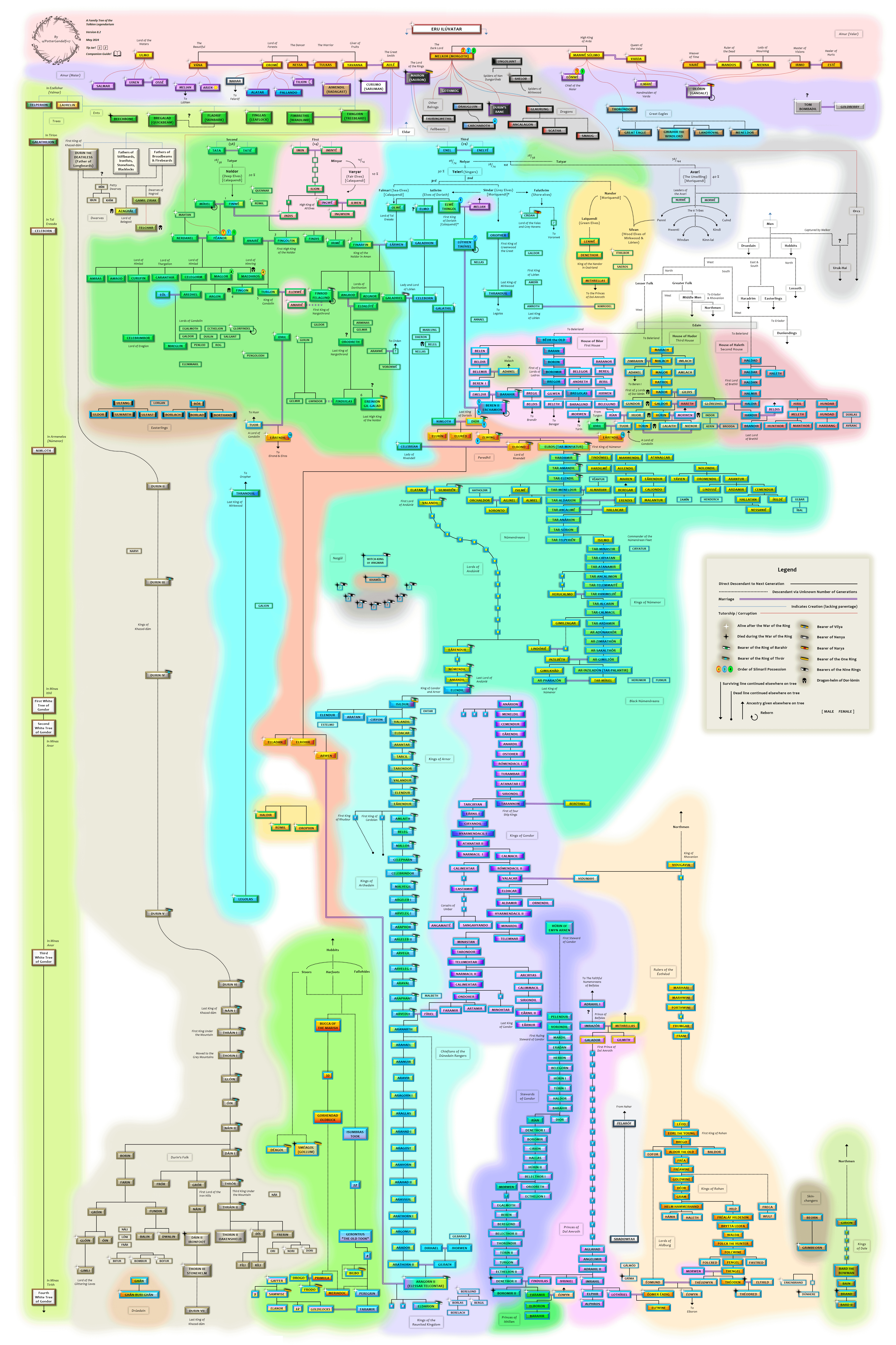 Please also download my [Companion Guide](https://drive.google.com/file/d/1ZUamMV0K4ZO7DPsX4uRi4FvLTdLzXwBS/view?usp=share_link), it has all the characters on the Tree (and some not on the tree) with pictures, birthdates, ruling dates, how many years alive/ ruled, and short character profiles that will help you navigate this tree and Tolkien’s legendarium as a whole. This whole project started back in 2012 and I’m still trying to find ways to improve it, hope you enjoy!