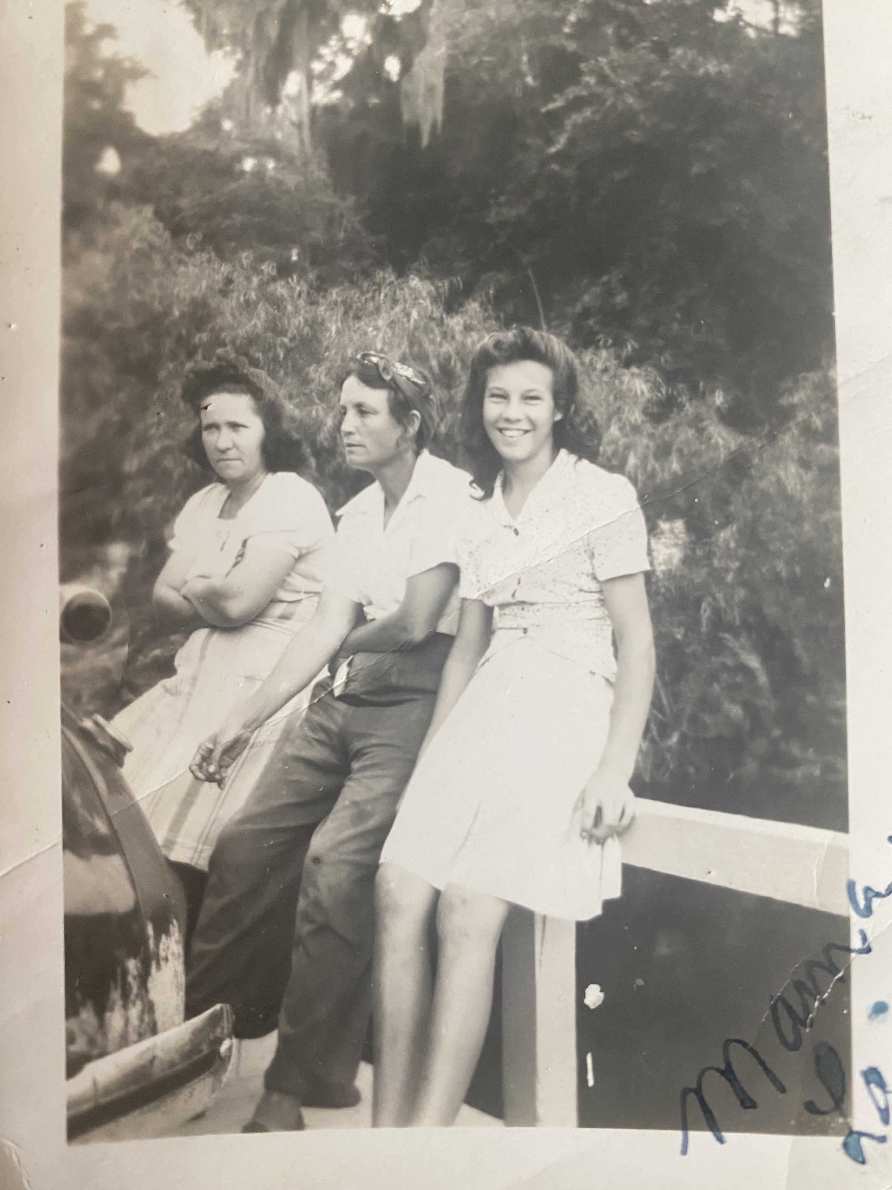 Here she is (in the middle) in work pants, hair back and messy, smoking a cigarette with zero posture. Her sister to the left of her was a force too. And there’s my sweet grandmother to the right, about 15-16yrs old, smiling ever so happily.