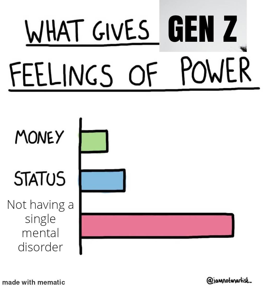 2. You’re forgetting that Gen Z are the ones who self diagnose themselves with a dozen mental illnesses to get attention