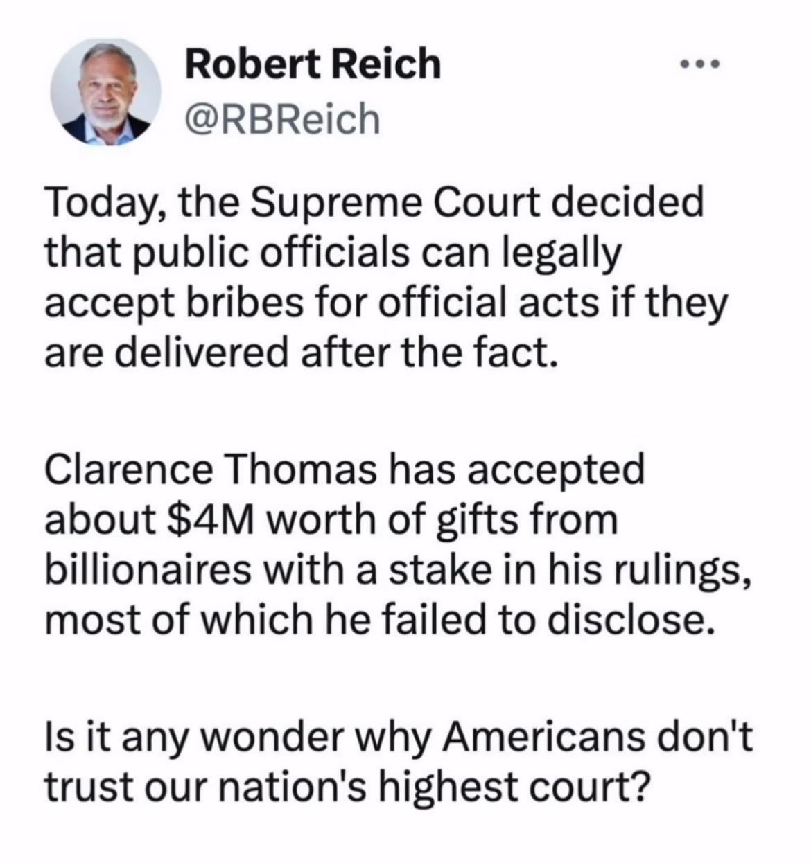 Add that to the Executive branch doesn’t get to enforce regulations, courts do and we will be seeing our first billionaire Federal Judges sometime soon. The Executive and the Legislative need to get together and pass some laws about ethics and consequences.