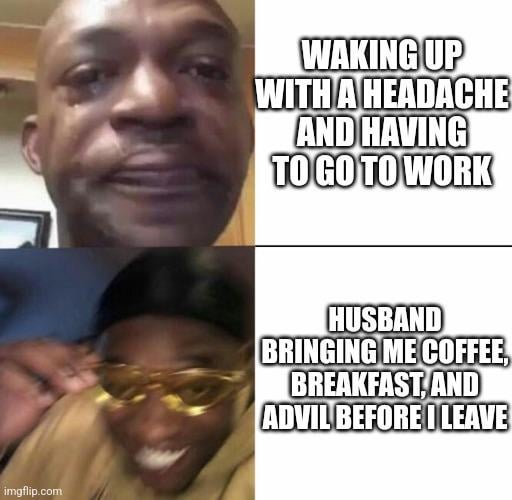 Best cure for a headache: coffee, breakfast, and a loving husband