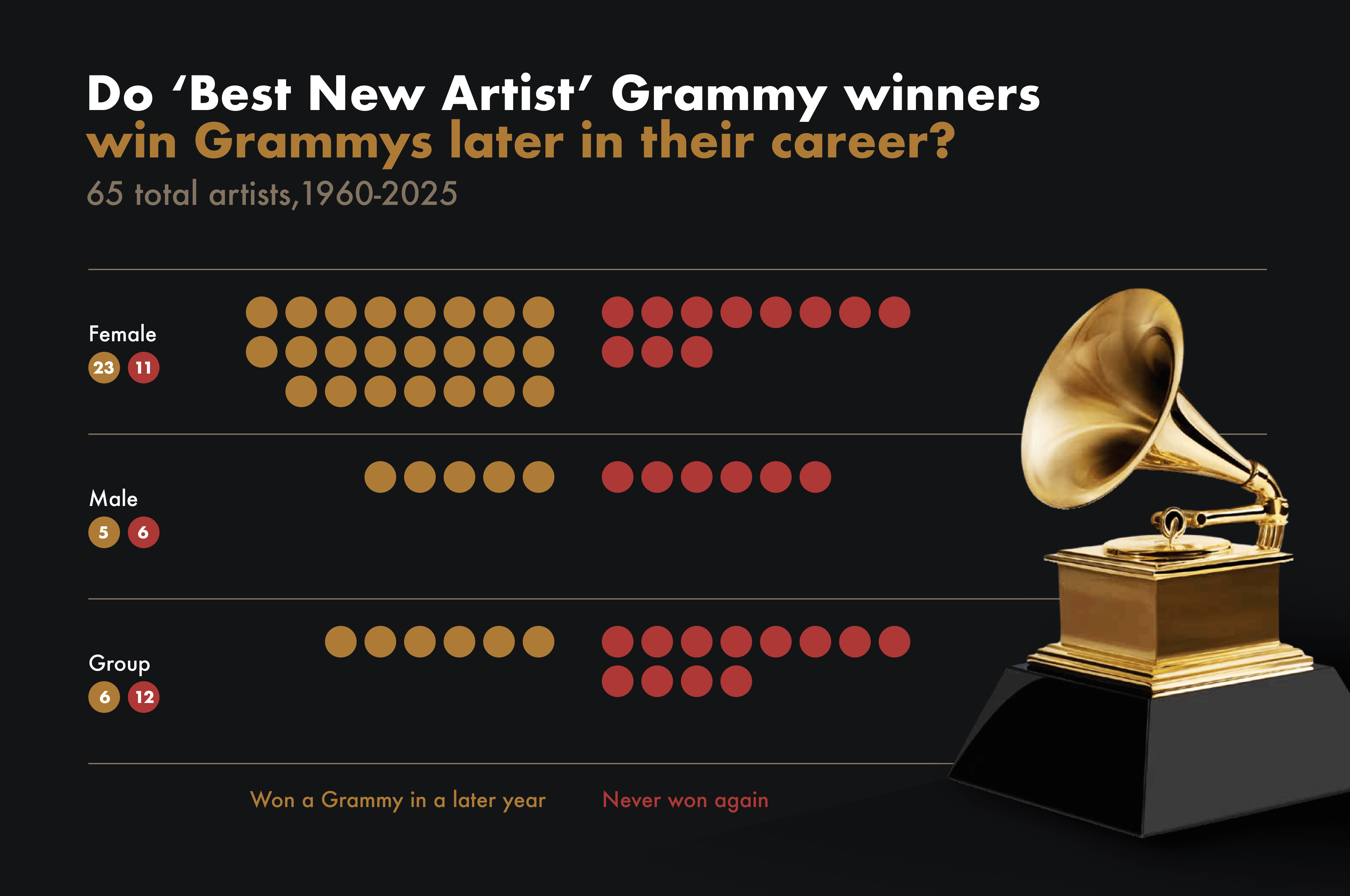 Dots represent wins in each segment (Female, Male, Group), with the dots on the left representing artists that went on to win another Grammy, and the right being ones that did not.