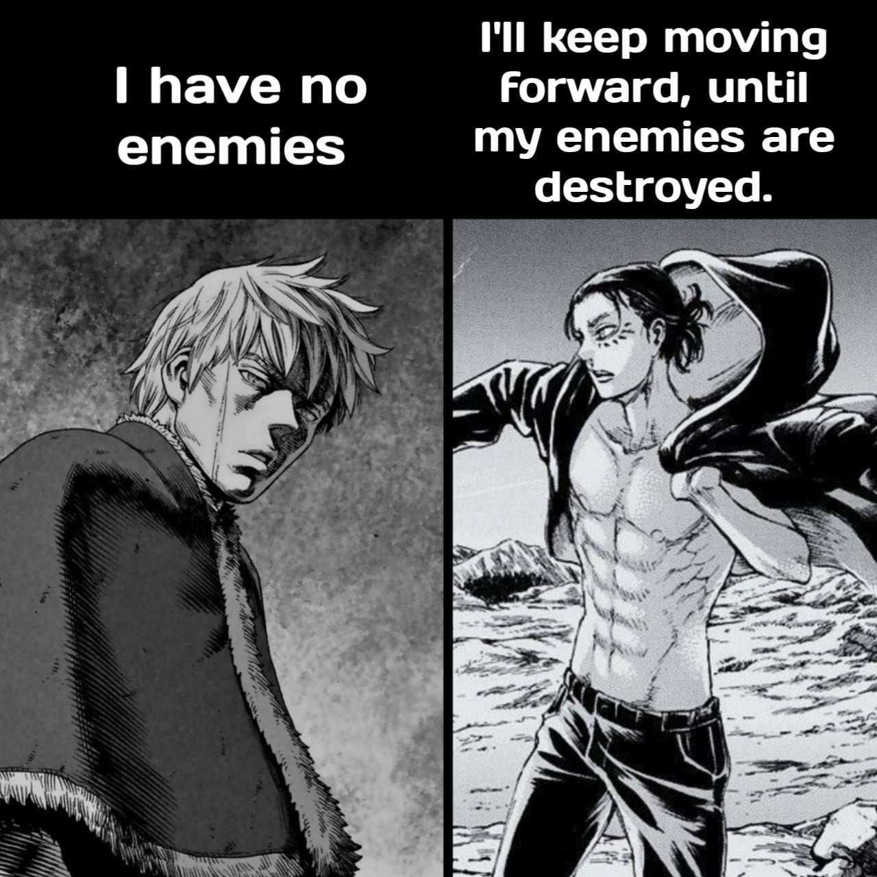 I have enemies so i will choose eren. I tried thorfinn but that’s doesn’t works in real life