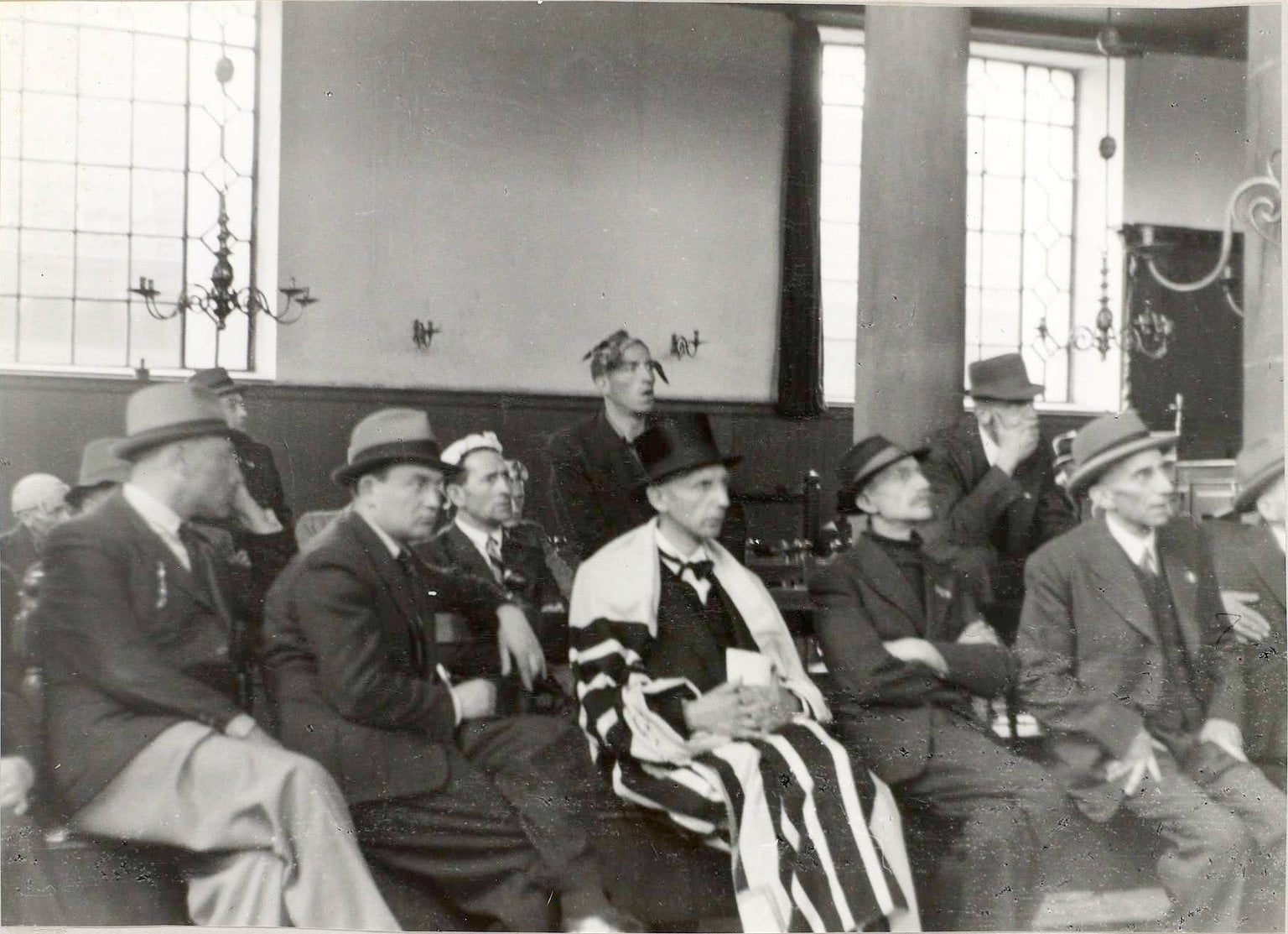 First service at the Portuguese-Israelite synagogue after the war. Two men are wearing handkerchiefs on their heads because they no longer own yarmulkes. Amsterdam, May 9th 1945. [1536 × 1113]
