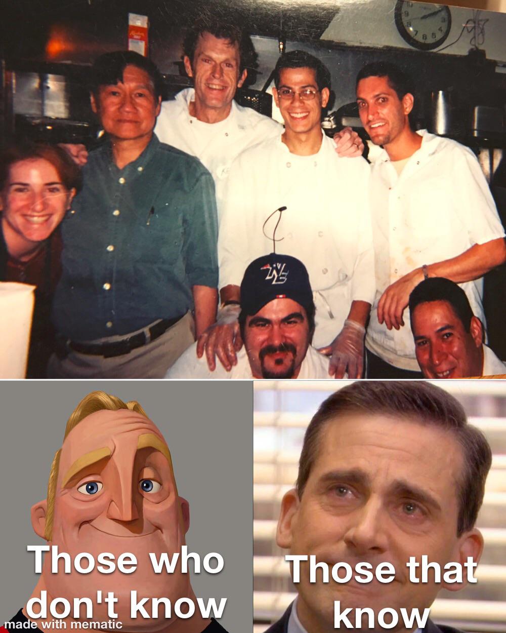 Most if all not in this picture are volunteers who cooked meals for the emergency service workers on 9/11 and shortly thereafter. The tall one is Kevin Conroy, voice of Batman in several animated appearances. When he and someone else were talking about their careers outside of this, it came out that he played Batman. Someone called BS, to make him prove it. Insert, “I am vengeance, I am the night, I am Batman,” coming from the back kitchen.