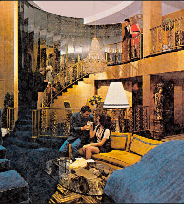 The models featured in the brochure were Caesar’s Palace employees: Bob Paluzzi (sofa); Charlie Monahan (staircase).