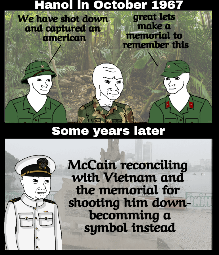 A small monument next to Truc Bach Lake celebrates the downing of McCain’s plane. “The citizens and military caught Pilot John Sidney McCain,” the statue’s engraving says. “This was one of 10 aircraft shot down that same day.”