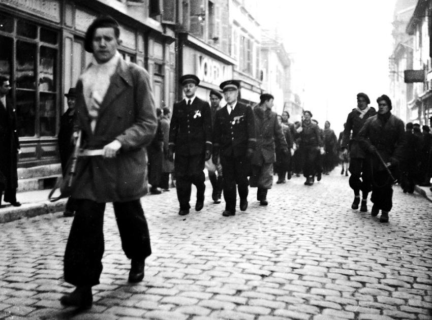 French resistants parading through the streets of Oyonnax to commemorate the 1918 Armistice; the German authorities forbade any commemoration of the anniversary, France 1943. [850×630]