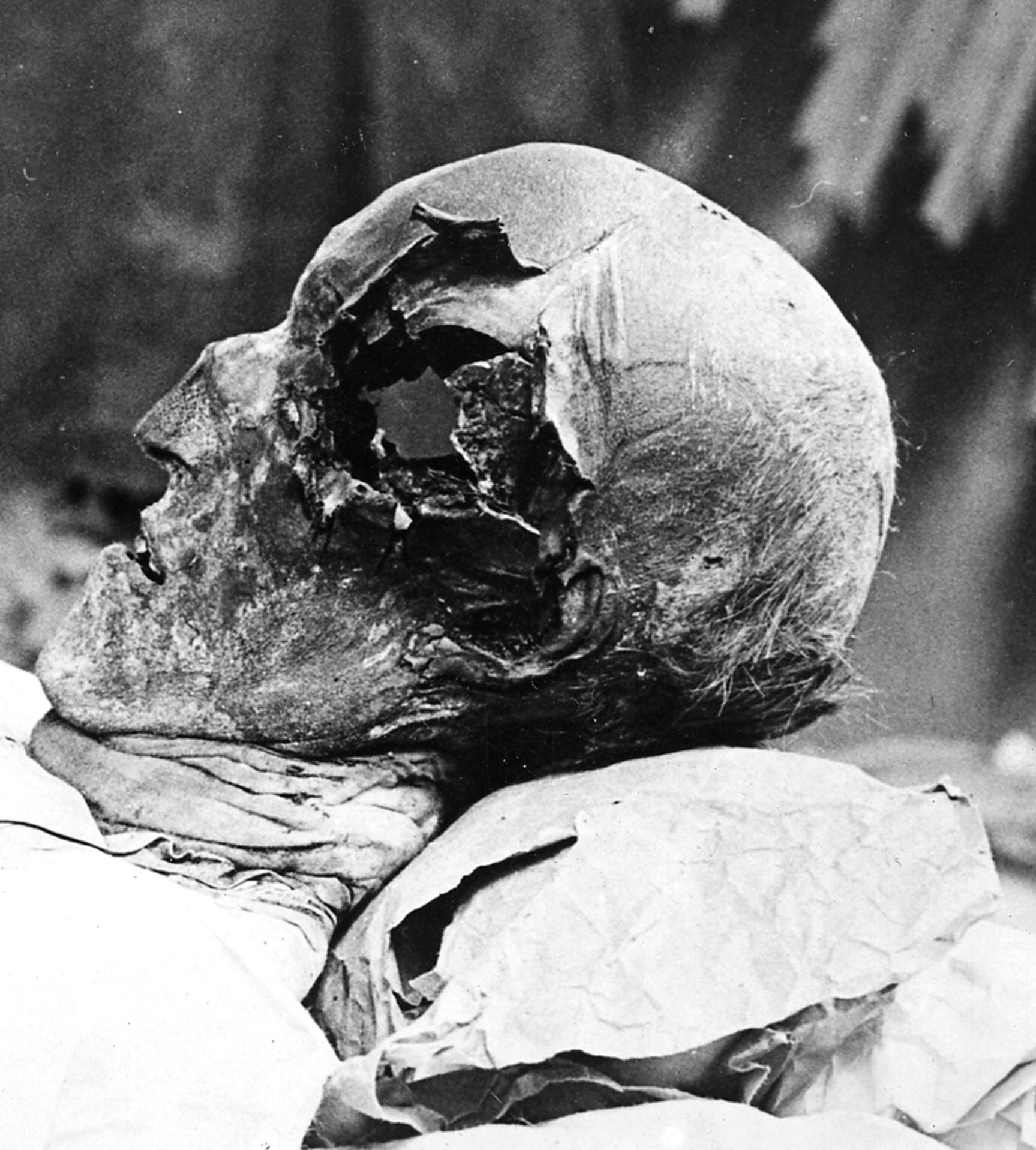 Photograph of the mummified skull of King Karl XII of Sweden (1682 – 1718) covered in papier-maché, taken on the 18th of June in the year 1917 during an autopsy – [1727 x 1917]