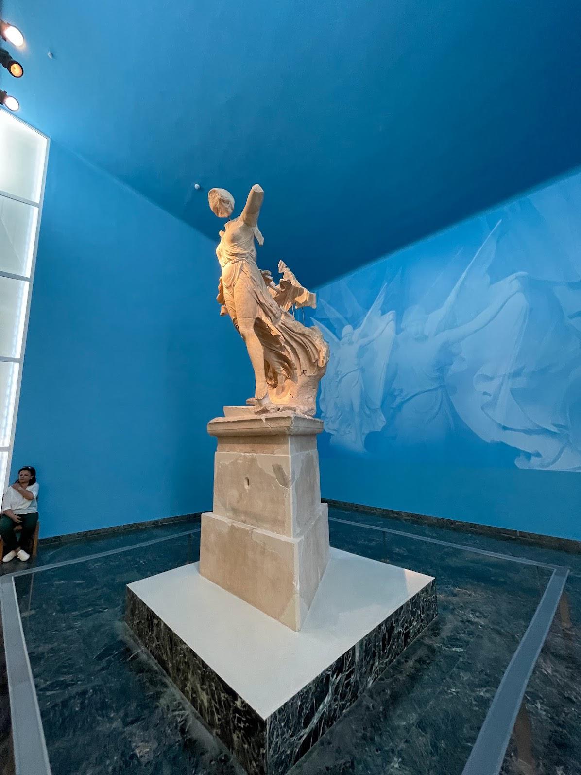 This Winged Nike was made to celebrate the victory at the battle of Sphactheria (in which a small contingent of Spartans surrendered to the Athenians in an unprecedented event) during the Peloponnesian Wars and it stands now @ the super Olympia Museum.
