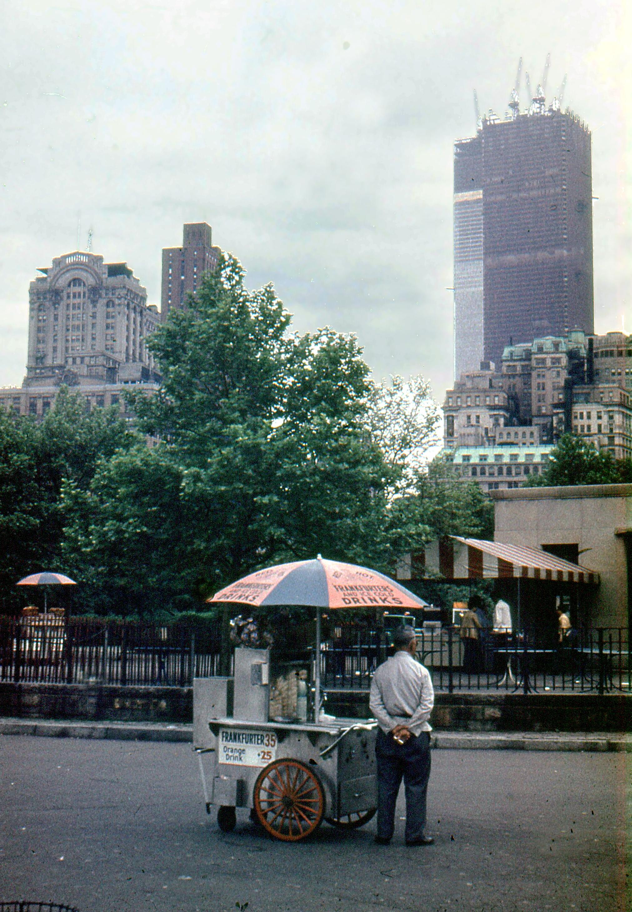 Hot dog vendor near the construction site of the World Trade Center in New York, early summer 1971. by Aeromarine_eng
