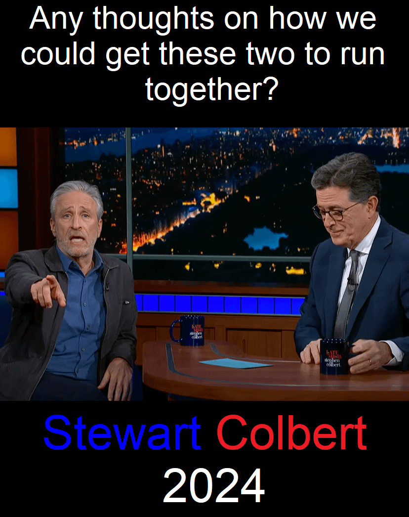 Honestly I wouldnt want them to run. I think we need people like Stewart who are on the ground and pressing our government with the tough questions and getting support from regular citizens. In office they would get railroaded by the other congressman. They can do that in office too, but I dont think they would be as successful.