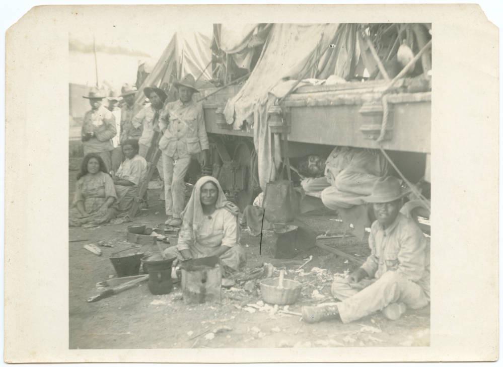 Mexican soldiers, and what looks like some female camp followers, camping on and under a flatcar during the Mexican Revolution. Circa 1914.