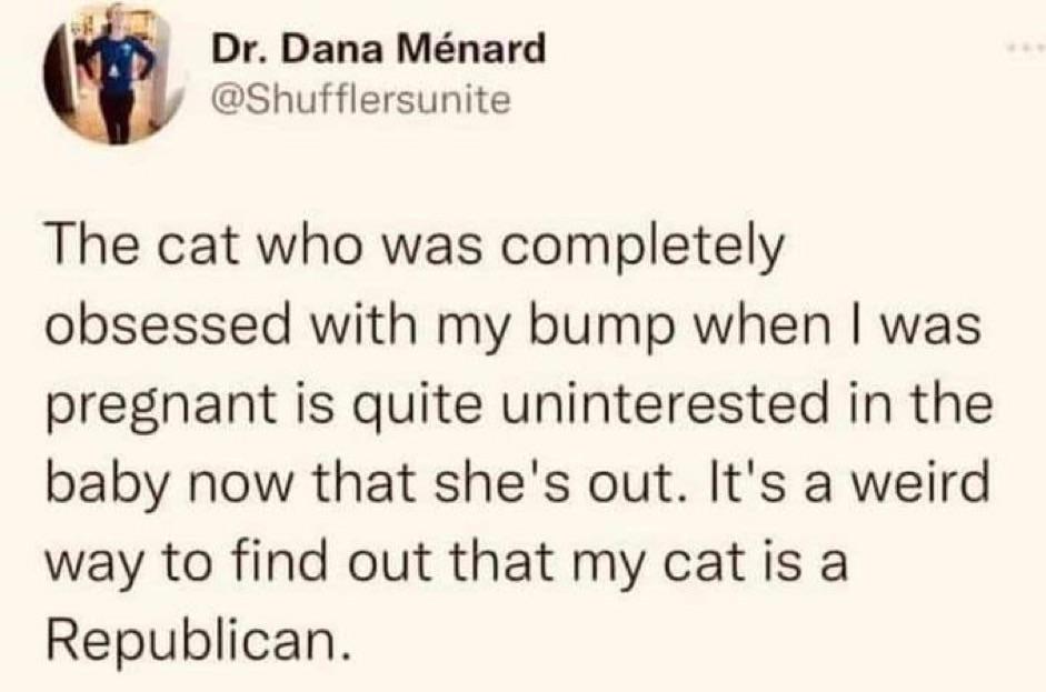 ZigZagZedZod on September 11, 2023 11:54 pm Cats are like libertarians: absolutely convinced of their fierce independence while utterly dependent on a system they don’t appreciate or understand.