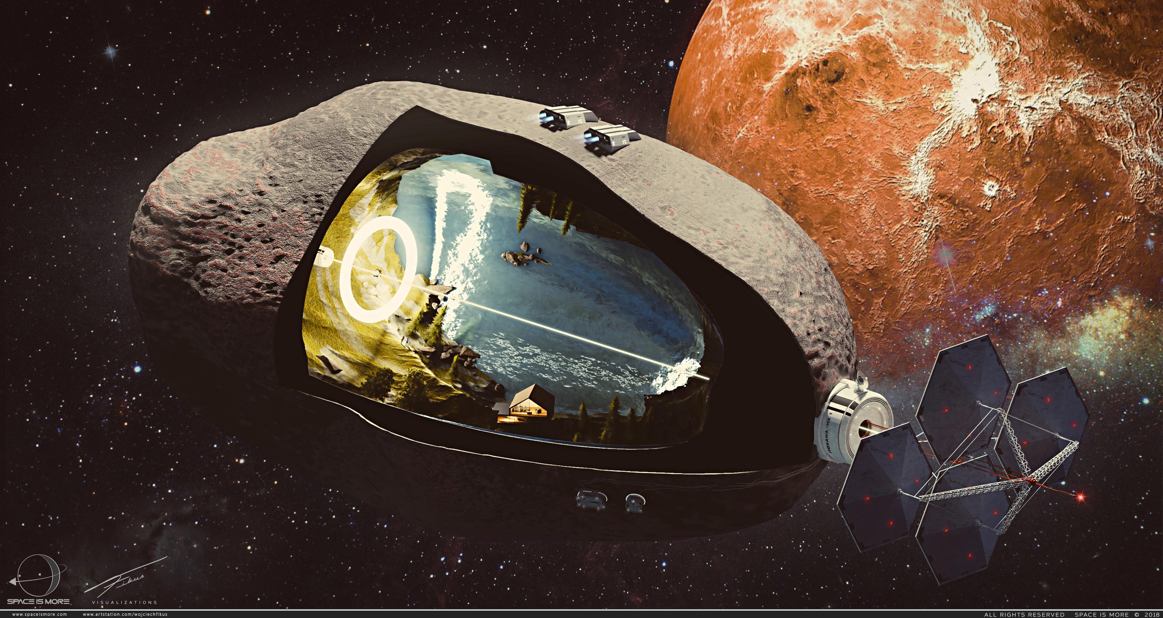 YanniRotten on April 21, 2025 1:48 pm “3d section of a small, hollow asteroid with micro-habitat inside inspired by some retro sci-fi arts.” Source: https://www.artstation.com/artwork/BdnEr Artist: https://www.instagram.com/wojtekfikus
