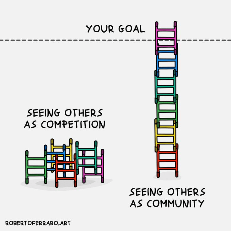 The goal should be a community goal like collecting many fruits off a tall tree to share. In this case only the purple one has crossed the line, and the red one’s life is worse for it.