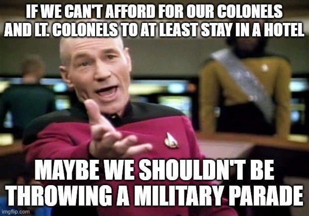 Only third rate dictatorships need or want military parades, especially BIRTHDAY parades. Our military doesn’t need to parade around to show how badass it is. Only shit heel countries need it, with good examples being North Korea and especially Russia. It’s a joke and rightfully so. Only the weak need military parades. Weak egos, weak dicks, and weak IQs. And guess who fits that bill?