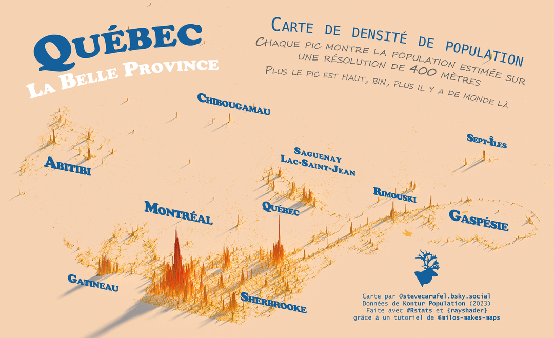 dairyfreemilkexpert on May 31, 2025 5:06 pm Made with R and {rayshader} thanks to a tutorial by milos-makes-maps : [https://www.youtube.com/watch?v=qTDf5VVnjMM&pp=ygUYbWlsb3MgbWFwcyBzcGlrZSBkZW5zaXR5](https://www.youtube.com/watch?v=qTDf5VVnjMM&pp=ygUYbWlsb3MgbWFwcyBzcGlrZSBkZW5zaXR5) Data is from Kontur Population (2023), an estimate based on multiple sources from satellites and websites : [https://data.humdata.org/dataset/kontur-population-canada](https://data.humdata.org/dataset/kontur-population-canada) Github repo and code [https://github.com/datacarvel/quebec3dpop](https://github.com/datacarvel/quebec3dpop)
