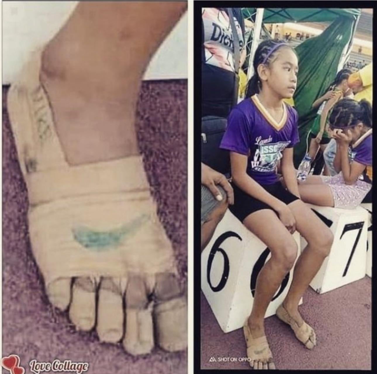 She didn’t have enough money to buy sneakers for the competition she wanted to join, so she wrapped her feet with pinstripe tape and ran anyway.