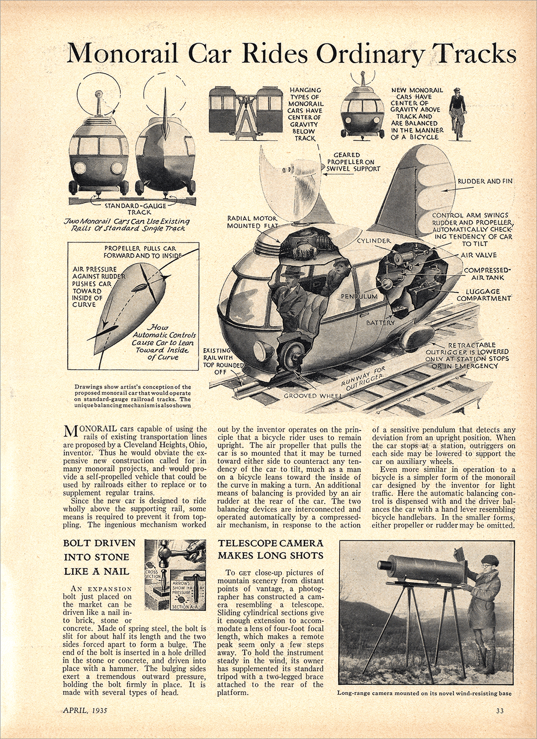 Good ol’ monorails, for decades provided a significant percentage of futurists predictions 🙂 Experiments were done of course with propellor driven trains, and gyro-stabilized monorails, but the experiments showed that in the end there was nothing to be gained by doing so.