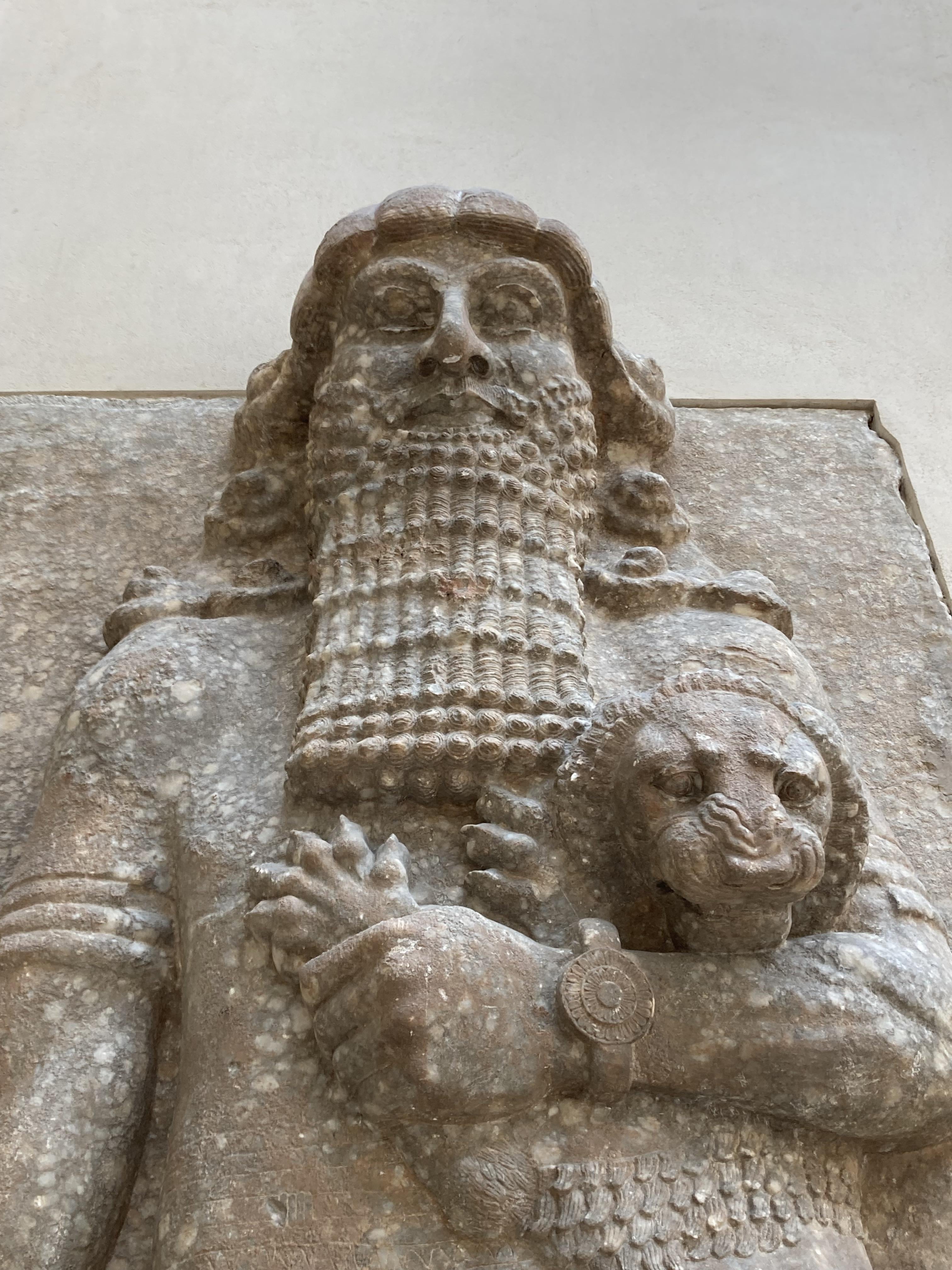 Statue showing an Assyrian Hero, often identified as Gilgamesh, the legendary king of Uruk. He is holding a lion in a powerful grip. This symbolizes the kings strength and power, domination over nature and ability to protect the people. Neo-Assyrian period, 9th–7th century BCE [3024×4032]