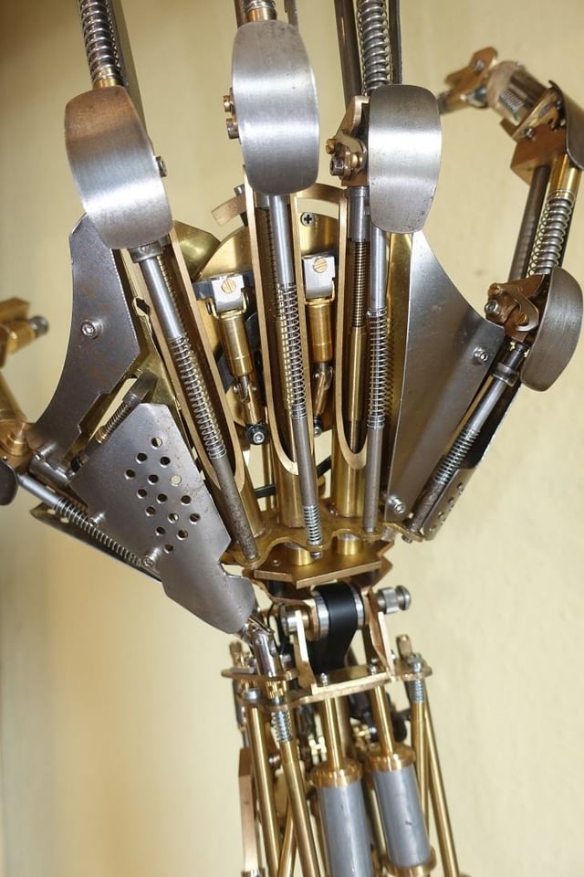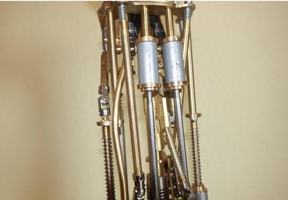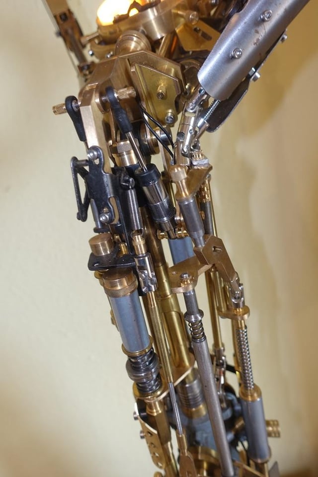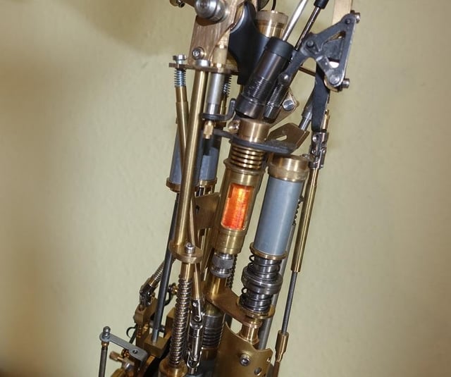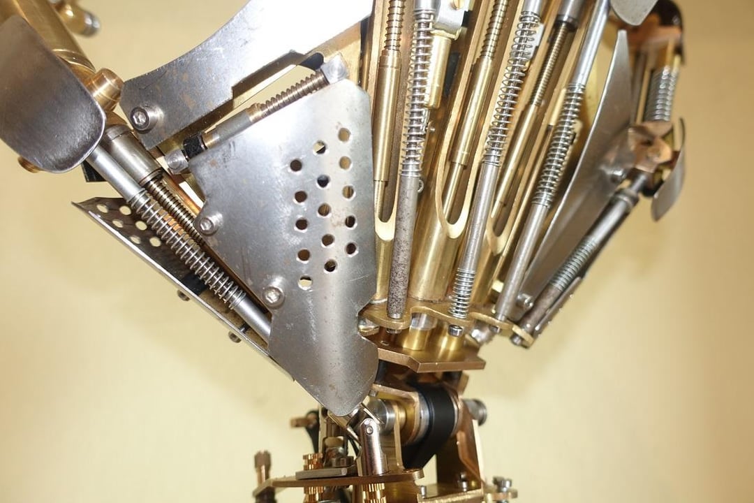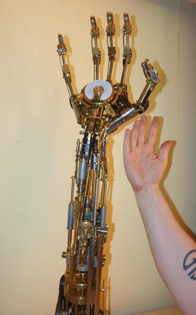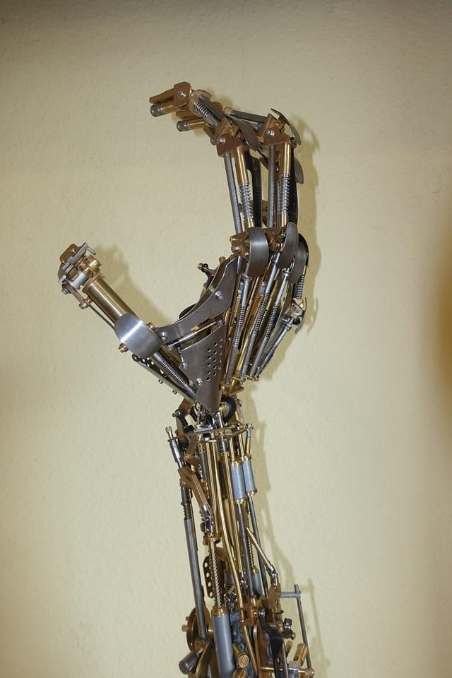 My second sculpture is finished: A full metal arm (550 hrs almost 3ft / 1m tall), made of countless selfmade parts plus antique typewriter parts (black) and industrial spare parts (2 larger alu parts) plus an old east german carburator. There are 2 angles that can be locked in place by a mechanism.
