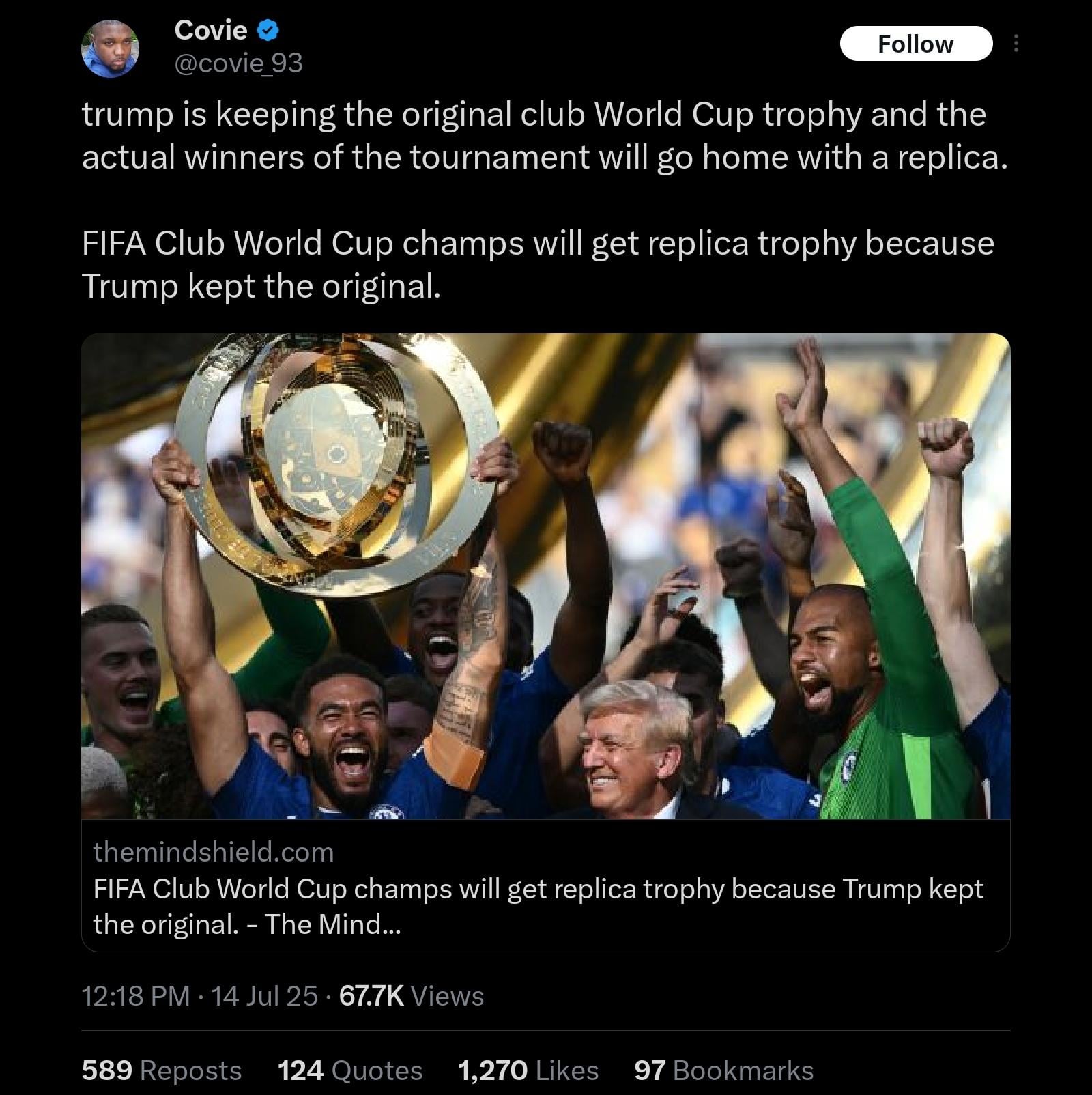 https://www.thedailybeast.com/trump-kept-gold-club-world-cup-trophy-for-himself-so-fifa-had-to-give-the-winners-a-replica/ Trump Kept Gold Club World Cup Trophy for Himself So FIFA Had to Give the Winners a Replica