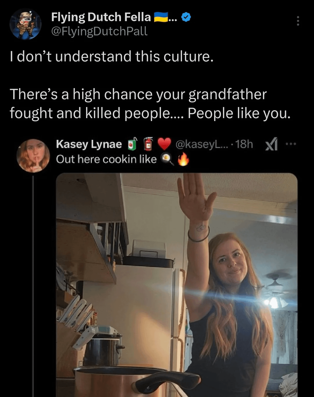 What’s sad is that you can tell by her kitchen and the background of the photo that she lives in a run down home. She’s likely very poor (that’s not the issue here) and is trying to get internet points for “being the superior race.” She should maybe try to be a better human and make something of herself and get out of poverty..