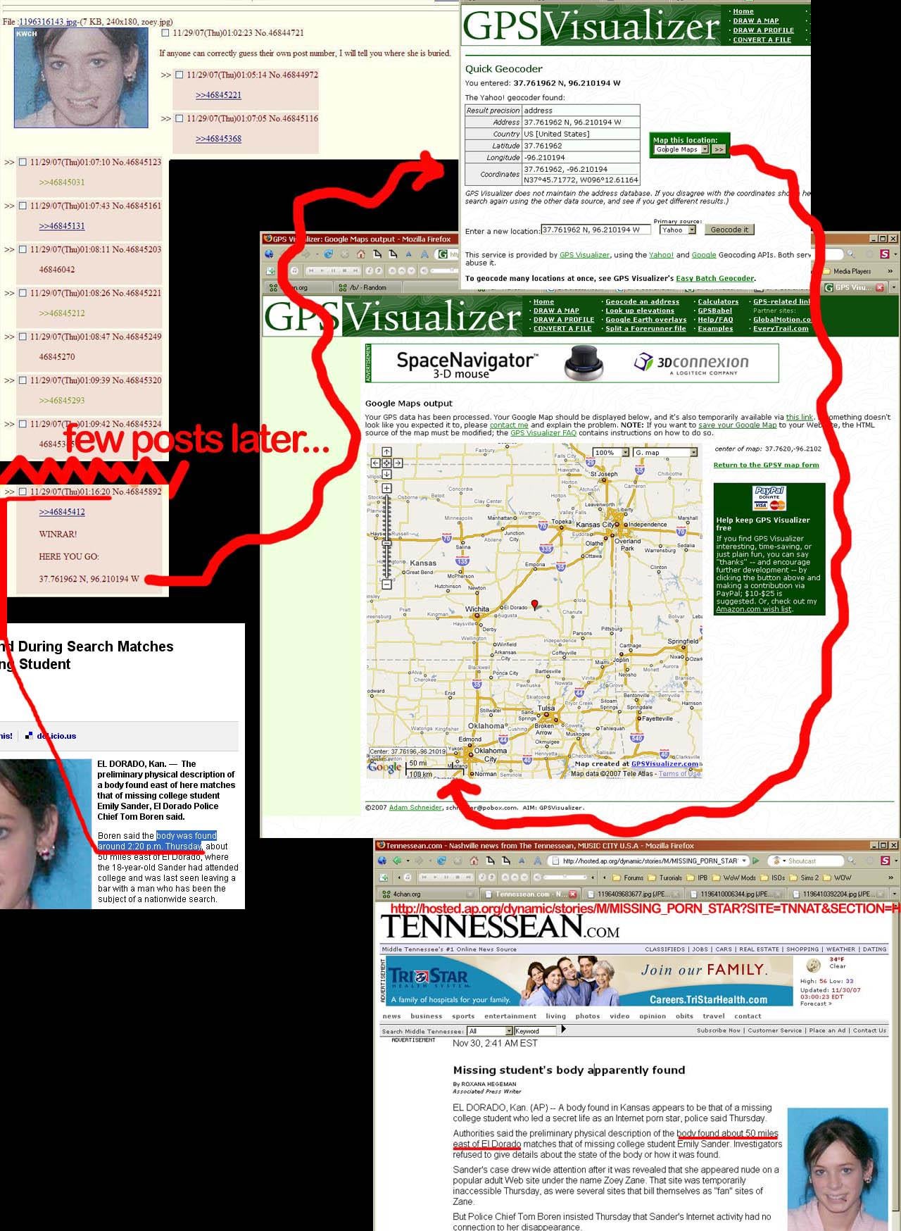 In 2007, a 4chan user revealed the coordinates of Emily Sander’s body after someone successfully guessed their own post number.