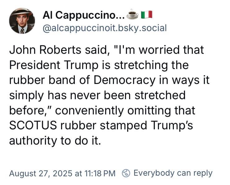 If Fed governors can be fired for doing their job, despite that being clearly illegal on dictatorial whims, and immigration judges can be fired on the same basis, the federal judiciary, including SCOTUS is on the face eating leopard menu too – first it will be one of the Democratic appointees – maybe for fun he’ll fire them for taking an honorarium from Harvard for a seminar or something and then he’ll come for anyone else, even his own appointees, if they’re insufficiently loyal. He’ll have his ICE Gestapo grab them and send them to Uganda or wherever. We’re getting close to that reality and Robert’s better wake the fuck up.