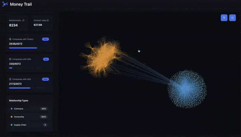 We’ve been working on a project called moneytrail.ai — a 3D interactive map of financial and commercial connections. The idea is to make the flow of money visual and explorable, instead of buried in spreadsheets.