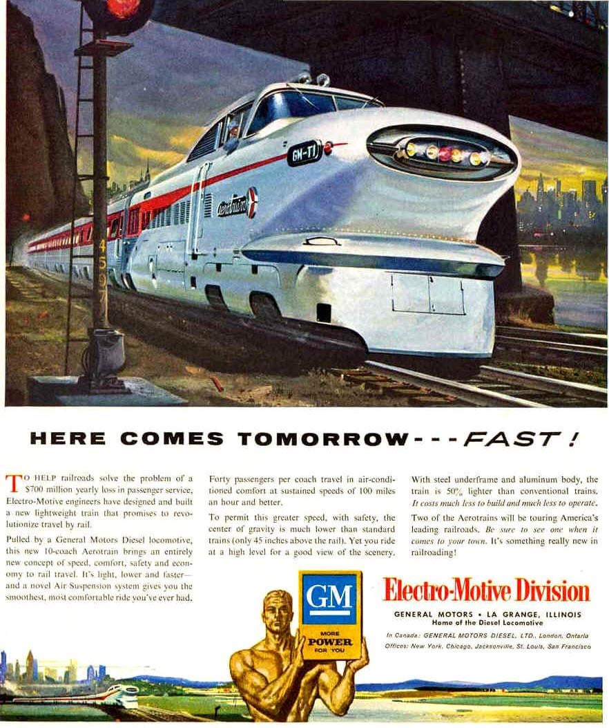 Aerotrain was General Motors’ attempt to create a fast, modern passenger train. Two were built with converted lightweight GM bus coaches. Only the Rock Island Railroad purchased one for commuter service. [1955]