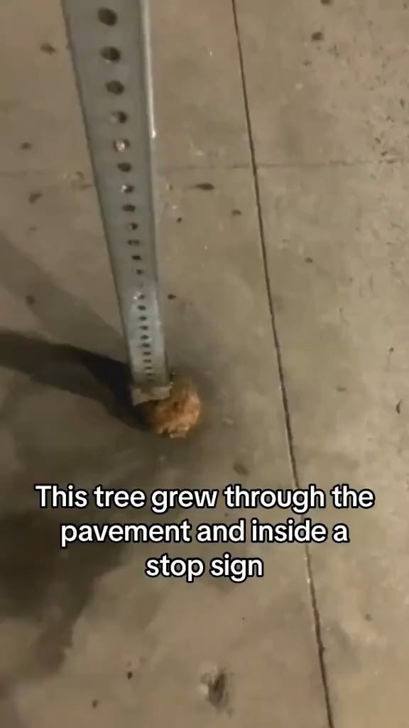 I wonder if the trunk will eventually envelop the sign post? Or will it grow in girth enough to split the post? Or will the tree adapt and stay skinny on the bottom of its trunk since it has extra support?