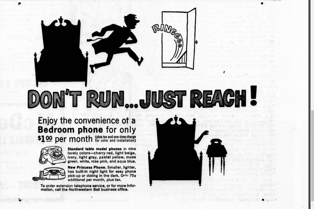 Northwestern Bell Telephone — October 13, 1960. “Don’t Run… Just Reach!” A bedroom phone extension for only $1.00 per month!