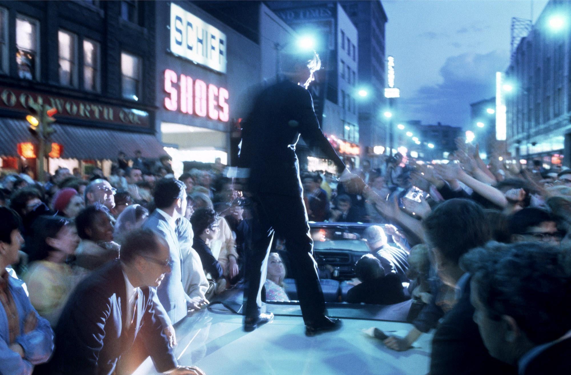 Senator Robert F. Kennedy greets the crowd from the top of his car during his 1968 presidential campaign bid.