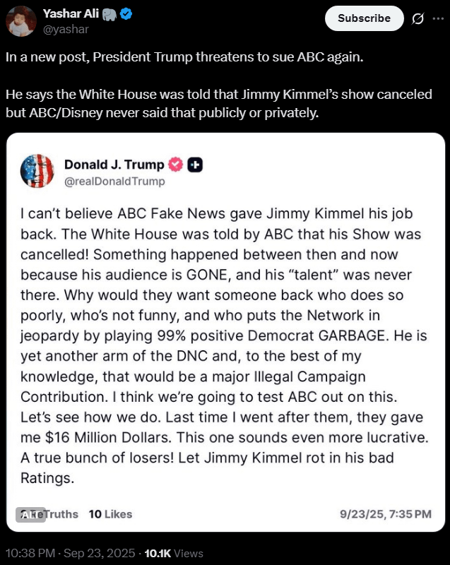 Trump wants to sue ABC for not cancelling Jimmy Kimmel. He is calling it an “Illegal Campaign Contribution” to have him on the air as he is an arm of the DNC.