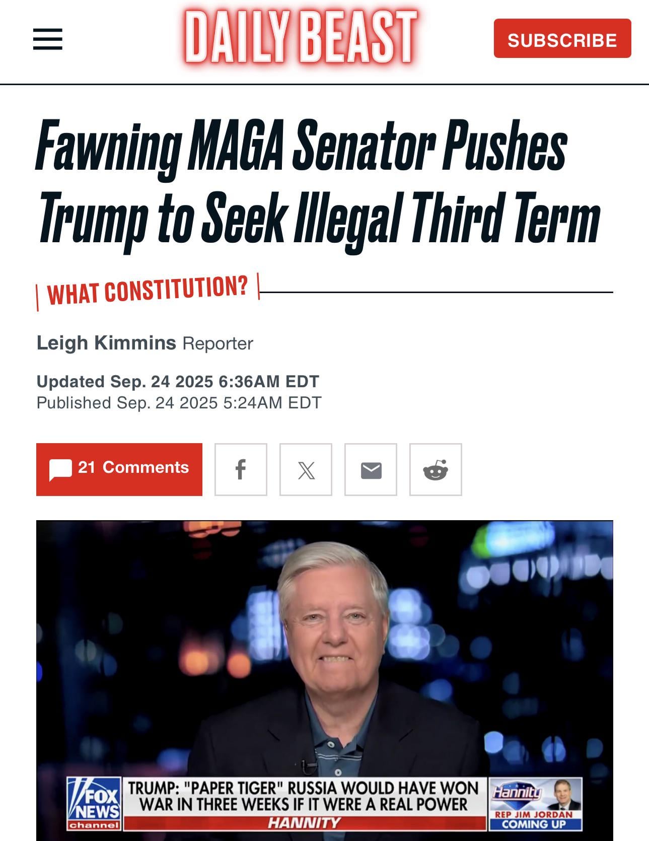 Sen. Lindsey Graham openly floated the prospect of Donald Trump serving an unconstitutional third term as president, telling Fox News: “Trump 2028. I hope this never ends.” … Graham closed by repeating: “I hope he runs again!”The South Carolina Republican has been floating the idea for months. In March, after Trump’s address to Congress, he posted: “My take on President @realDonaldTrump’s address tonight: Inspiring, funny, compelling and the Democrats’ worst nightmare. Trump 2028!” He later told reporters it was “a joke.”