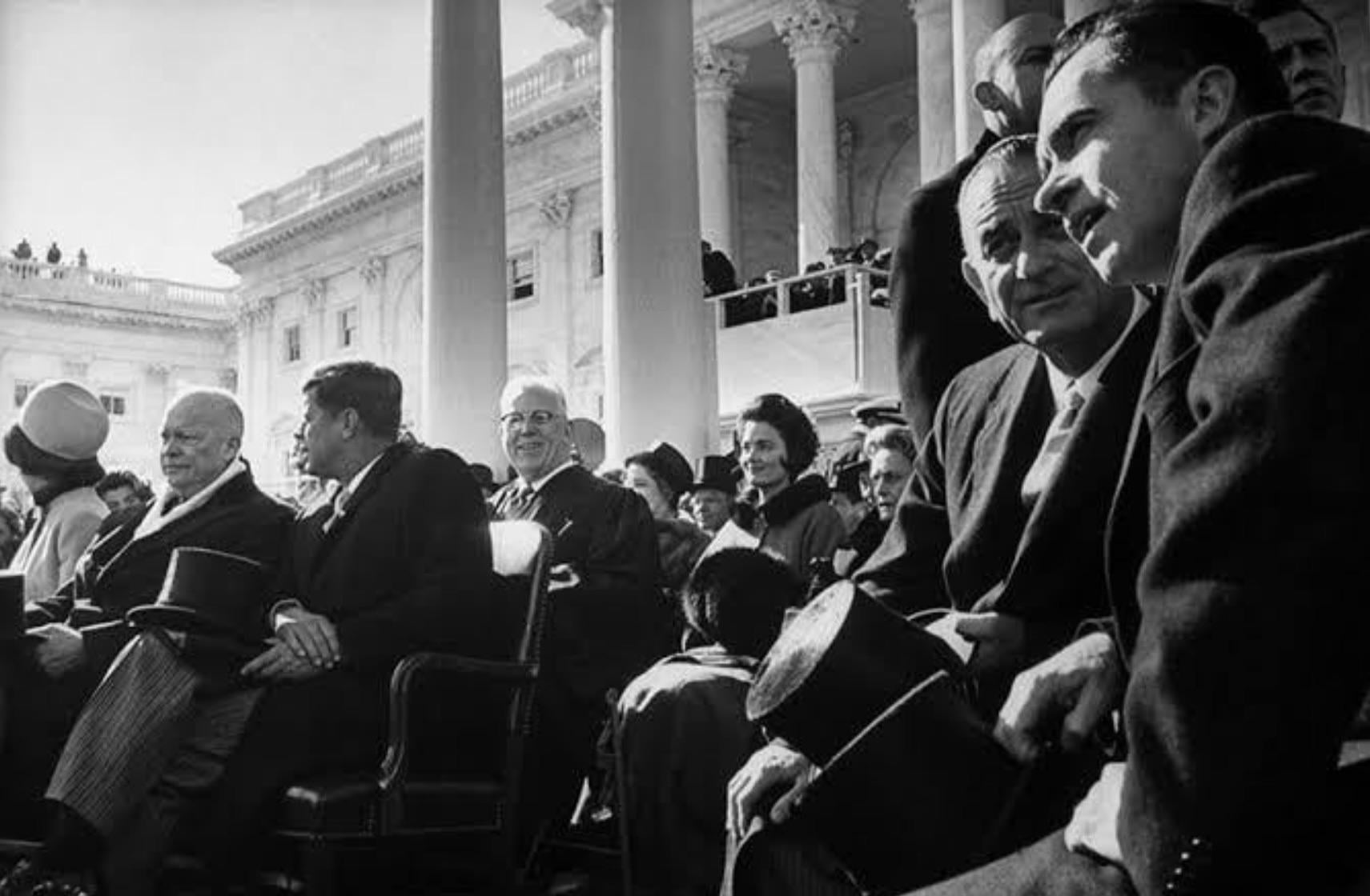 Is that Jackie sitting 2 rows behind JFK, or sitting with the hat next to Eisenhower? Both look like her. Amazing photo.