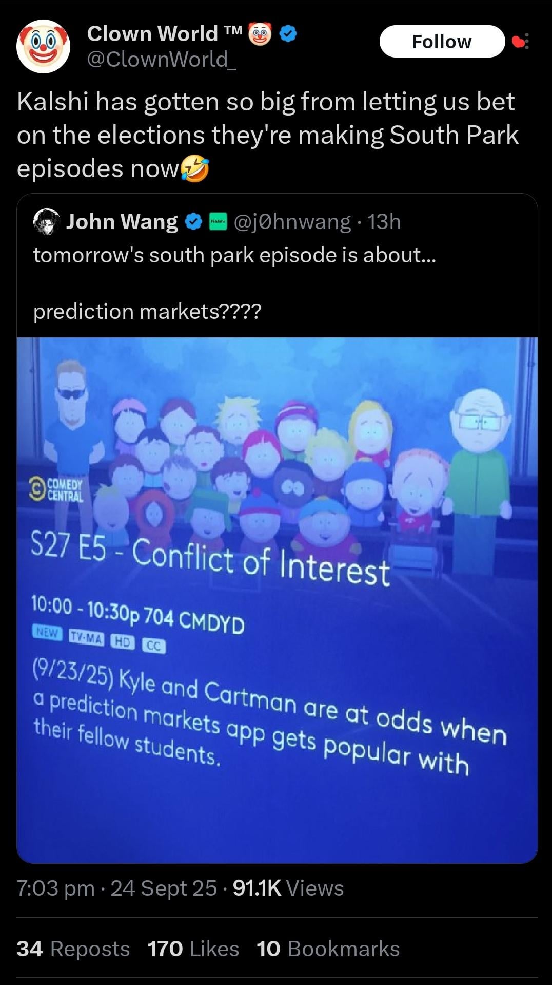 Codename-Nikolai on September 24, 2025 10:14 pm I had a bet on when South Park would make an episode on prediction markets. Big money