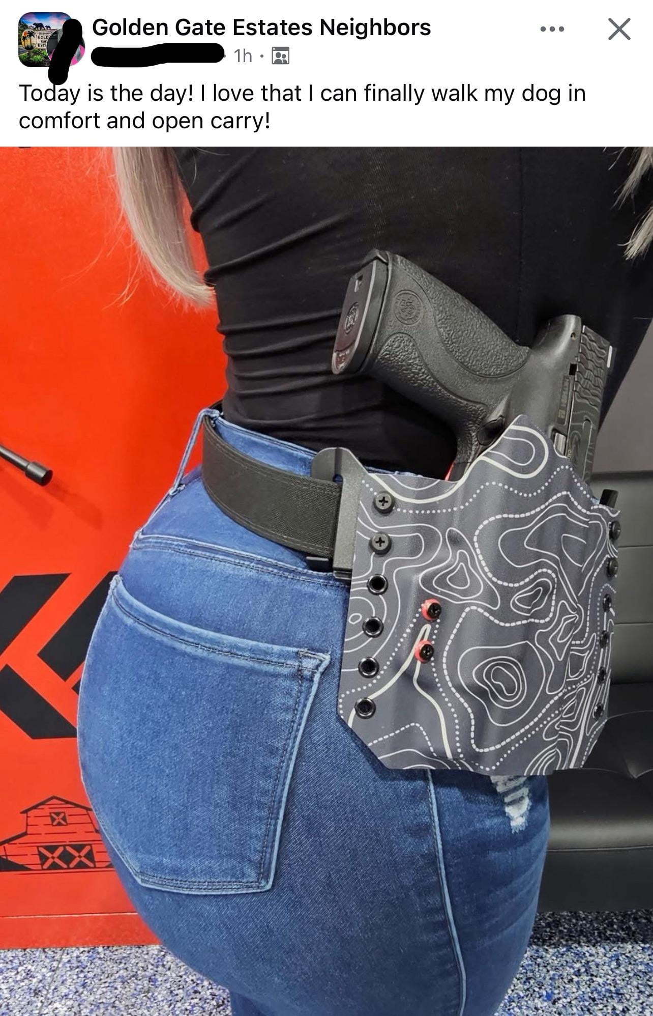 Open carry is dumb. Look at that shitty holster, it has zero retention meaning somebody can walk up to you and take that gun off your hip. It also doesn’t help that she’s wearing it as a fashion accessory. Guns or tools not toys and that holster screams I have no idea what I’m doing.