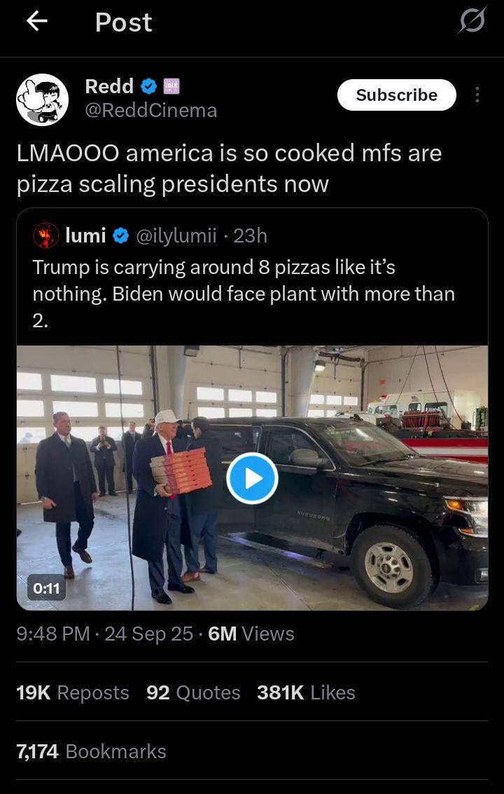 Trump is eating 8 whole pizzas like it’s nothing. Sleepy grandpa Joe would be full after one sensible sized slice!