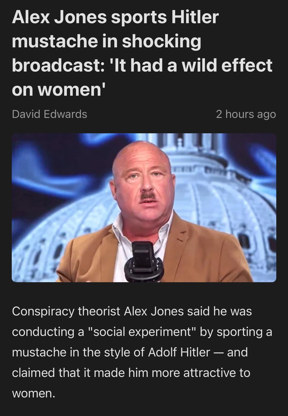 Deranged Conspiracy Wanker Claims Women Love His New Hitler Moustache: “I could tell you it had a wild effect on women. I thought they were about to start throwing their panties at me.”
